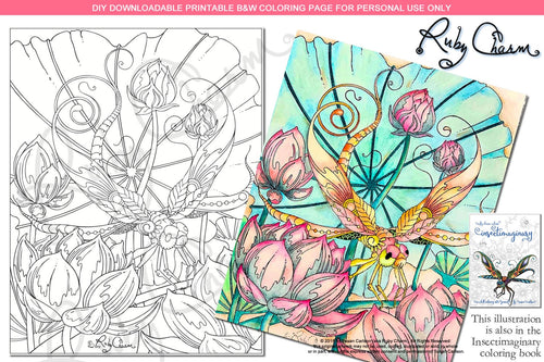 Insectimaginary Lotus Streamer Dragonfly: downloadable printable 2-page PDF for coloring