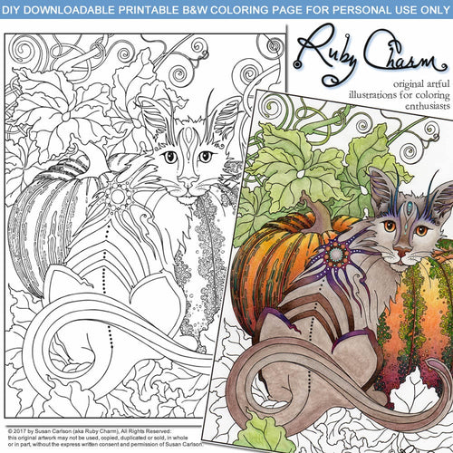 AUTUMN CAT: Downloadable printable 2-page PDF for coloring