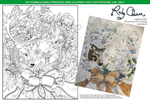 Christmas Holiday Animal Wreath: downloadable printable 2-page PDF for coloring