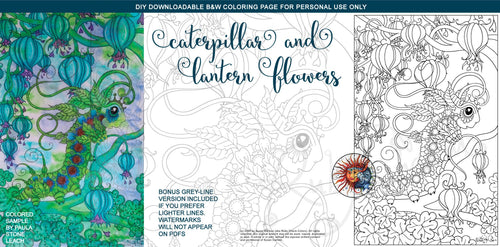 Caterpillar with Lantern Flowers: downloadable printable 2-page PDF for coloring