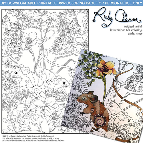 Mice in Freesia: downloadable printable 2-page PDF for coloring