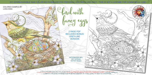 Bird with Fancy Eggs: downloadable printable 2-page PDF for coloring