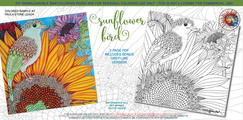 Sunflower Bird: downloadable printable 2-page PDF for coloring