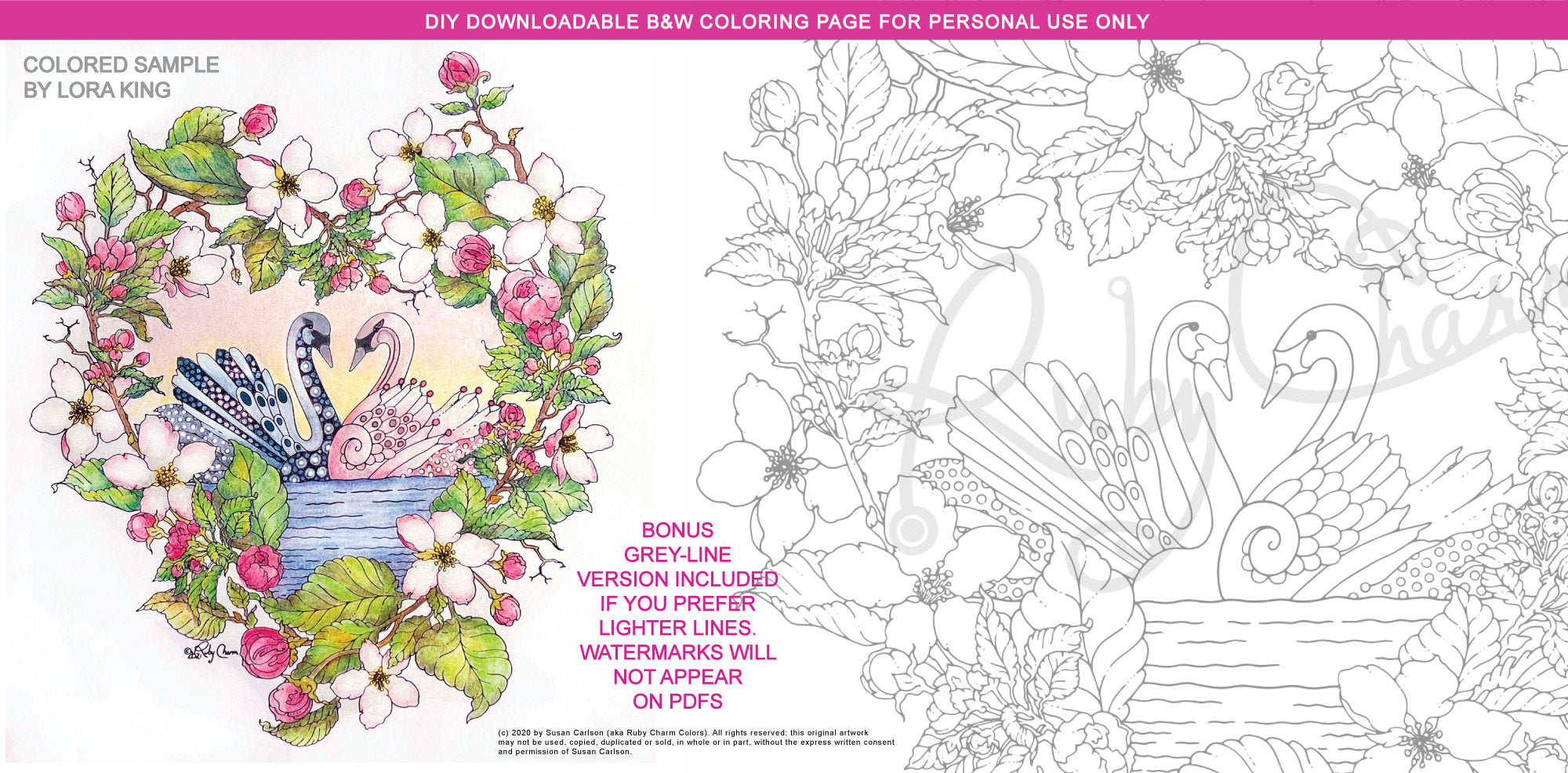 Apple Blossom Swans VALENTINE: downloadable printable 2-page PDF for coloring