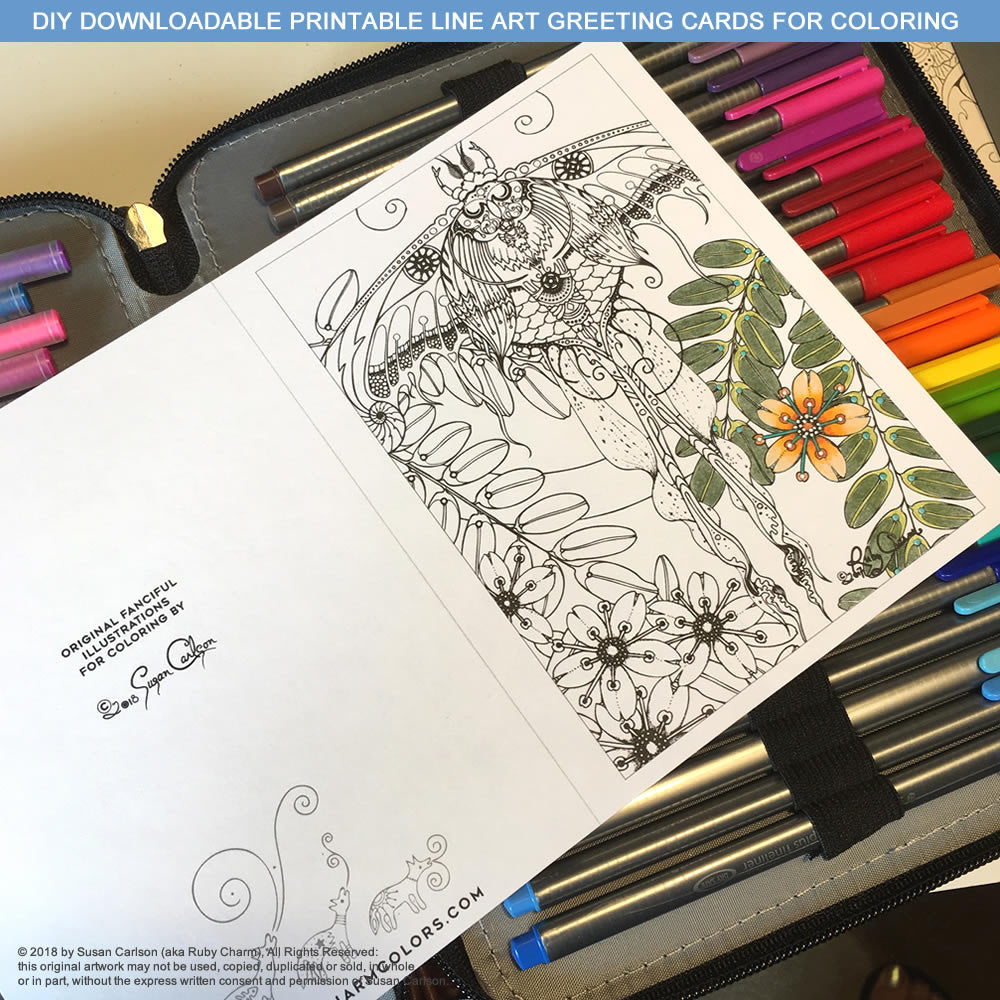 These illustrations were created especially for people who are enthusiastic about coloring, so grab your favorite colored pencils, markers, gel pens and/or watercolor pencils and paints! You’ll be able to instantly download (and save) these designs as watermark-free, 8.5 x 11" (letter-sized) PDF, and then print on the paper of your choice with your home printer. Because this is vector art, it can be enlarged if your printer is able to handle bigger sheets of paper. You may print extra copies to play around with different color palettes or experiment with different paper types - in fact, it it encouraged! Feel free to visit the Ruby Charm Colors blog for coloring tips, techniques and art supply reviews.