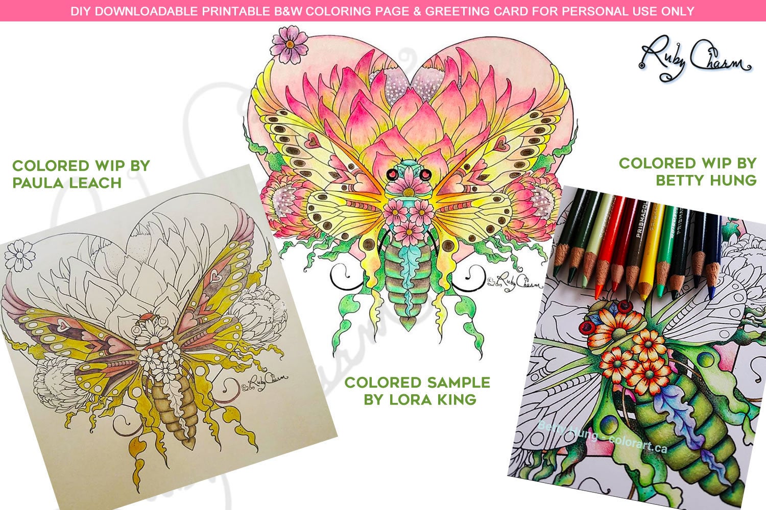 • Load image into Gallery viewer, Valentine Cicada Heart: downloadable printable 2-page PDF for coloring