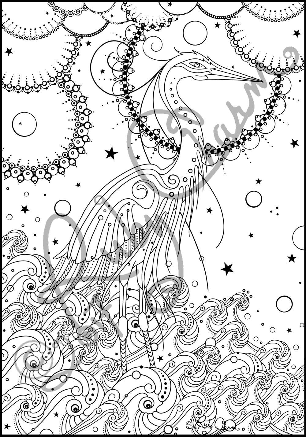Heron in Waves: downloadable printable 2-page PDF for coloring