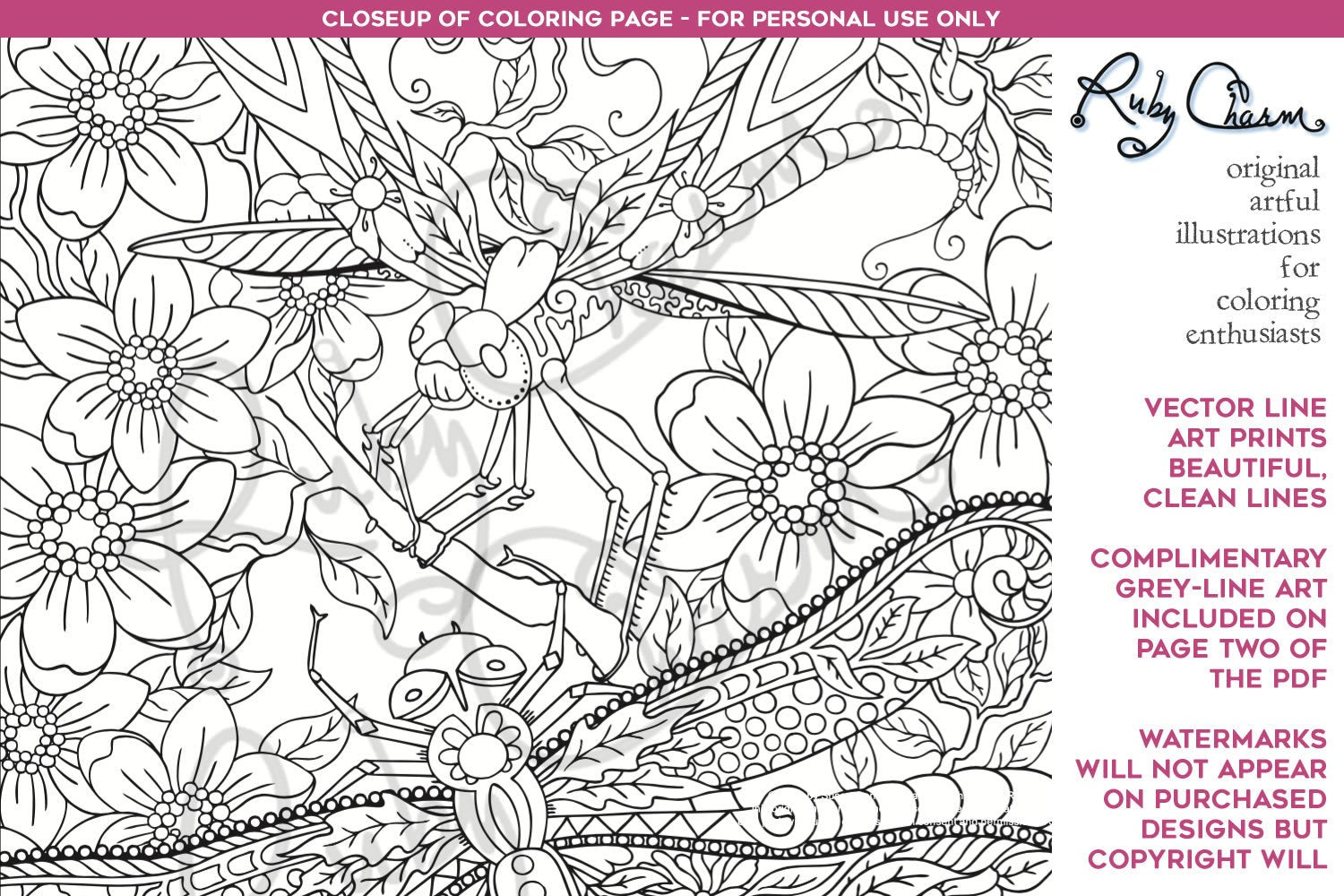 This illustration was created especially for people who are enthusiastic about coloring, so grab your favorite colored pencils, markers, gel pens and/or watercolor pencils and paints! You’ll be able to instantly download (and save) this design as watermark-free, 8.5 x 11" (letter-sized) PDF, and then print on the paper of your choice with your home printer. Because this is vector art, it can be enlarged if your printer is able to handle bigger sheets of paper. You may print extra copies to play around with different color palettes or experiment with different paper types - in fact, it it encouraged! Feel free to visit the Ruby Charm Colors blog for coloring tips, techniques and art supply reviews.
