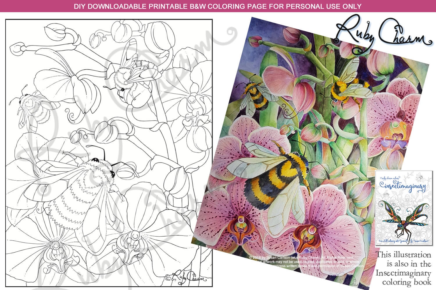 Insectimaginary Orchid Bumbles: downloadable printable 2-page PDF for coloring