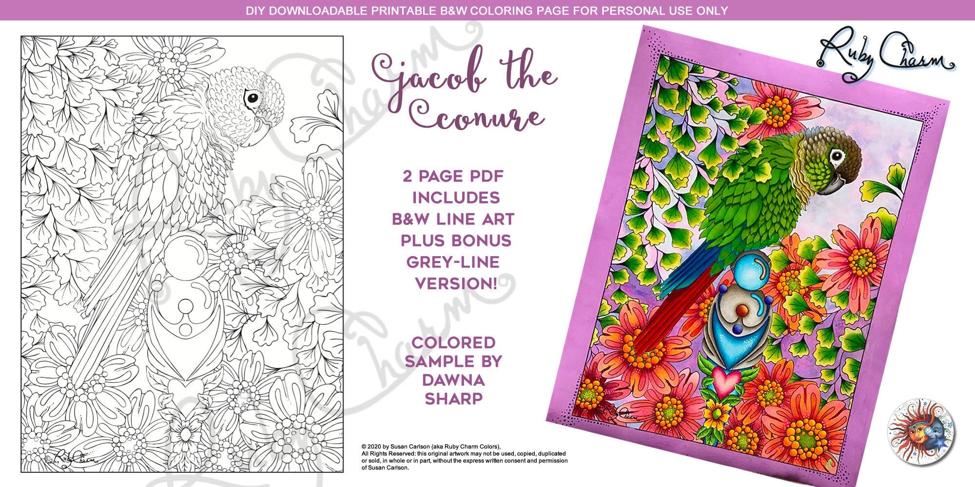 Jacob the Conure: downloadable printable 2-page PDF for coloring