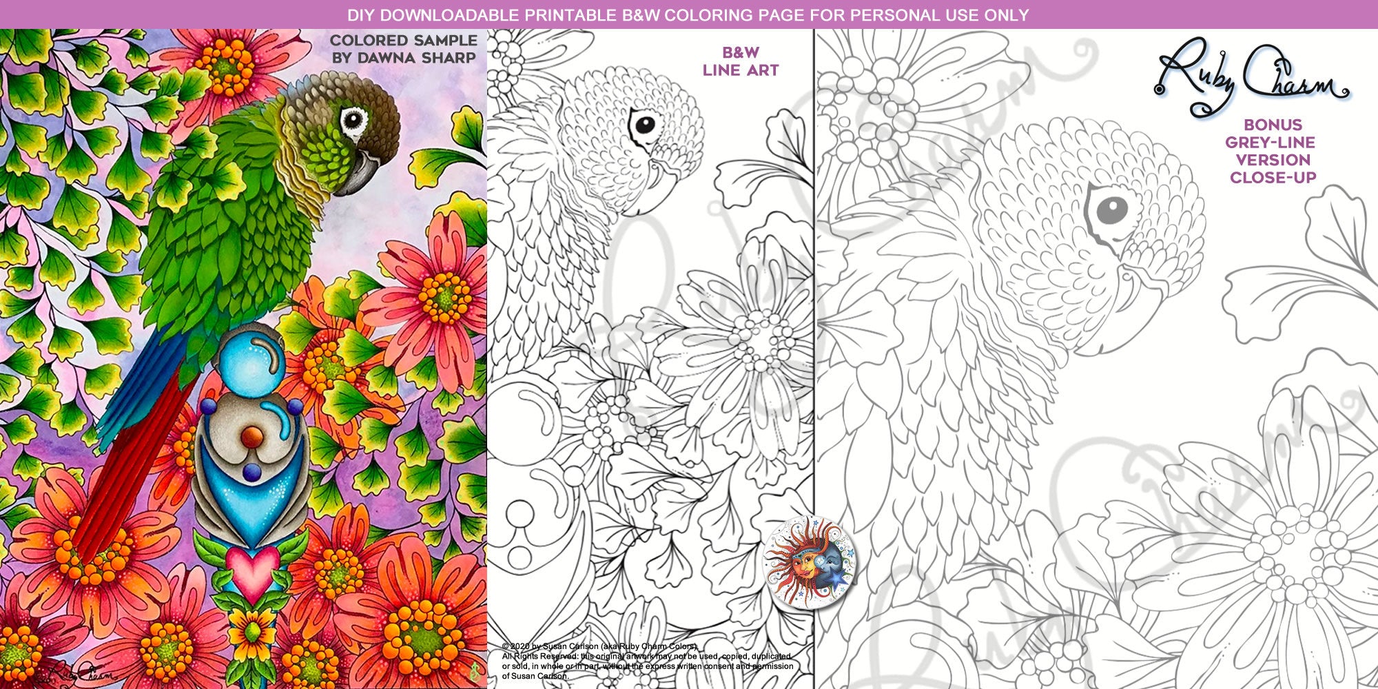 IMPORTANT LEGALESE ….. Please respect the time and effort that went into creating these illustrations (all of the art is copyrighted) and do not share or sell the PDF file and do not sell printed copies, or use the image commercially. This coloring page is for your PERSONAL USE AND ENJOYMENT. Selling any and all items using this image is prohibited. You are not permitted to send the files to other people or sell/trade/give them away. Please do not post this image online without your coloring it first. If you want to share your colored creation online, PLEASE DO! But please credit #RubyCharmColors (Susan Carlson) as the artist of the original illustration in addition to yourself as the colorist. The artist retains all copyright protections, rights, and privileges. Thank you for understanding and for supporting an independent artist!