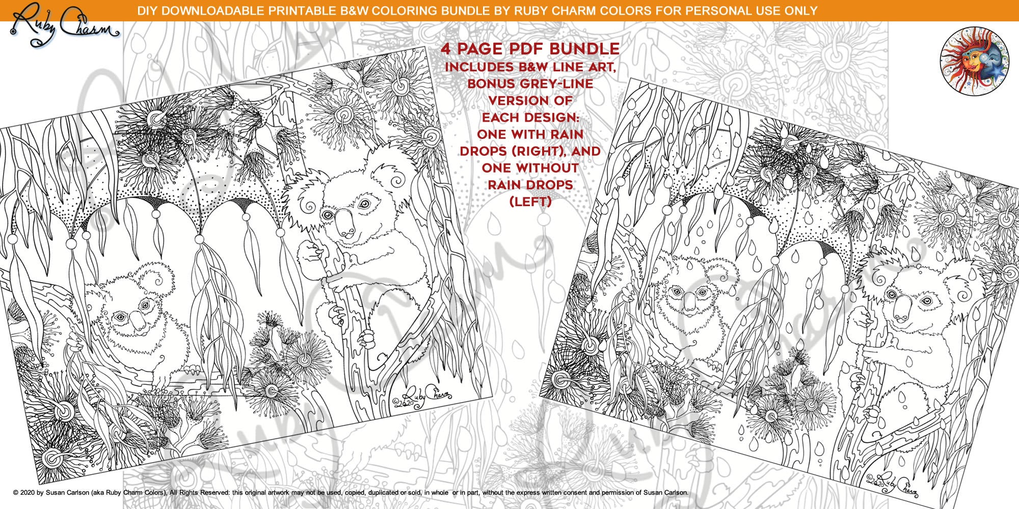 IMPORTANT LEGALESE ….. Please respect the time and effort that went into creating these illustrations (all of the art is copyrighted) and do not share or sell the PDF file and do not sell printed copies, or use the image commercially. This coloring page is for your PERSONAL USE AND ENJOYMENT. Selling any and all items using this image is prohibited. You are not permitted to send the files to other people or sell/trade/give them away. Please do not post this image online without your coloring it first. If you want to share your colored creation online, PLEASE DO! But please credit #RubyCharmColors (Susan Carlson) as the artist of the original illustration in addition to yourself as the colorist. The artist retains all copyright protections, rights, and privileges. Thank you for understanding and for supporting an independent artist!