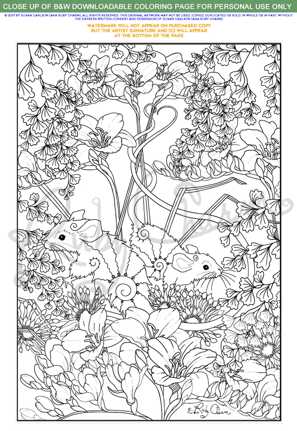 BONUS: This 2-page PDF includes a black line "Mice in Freesia" design as well as a lighter grey line version which can be helpful if you like to work with watercolors, or simply want more emphasis on your shapes and colors instead of the traditional dark black lines. The choice is yours!
